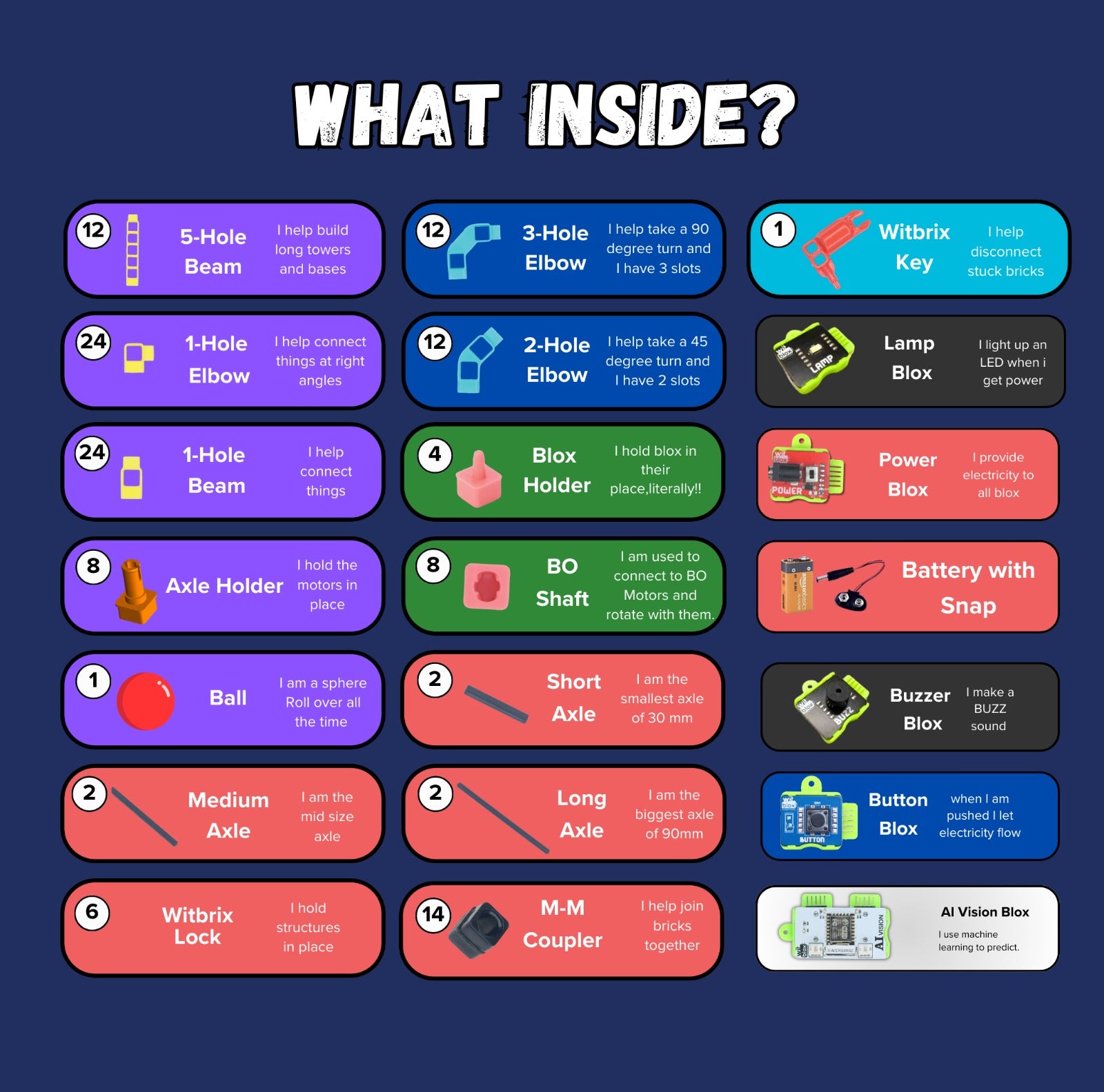 5-Hole Beam, 1-Hole Elbow, Axle Holder, Axle Coupler, 2-Hole Elbow, BO Shaft, 30mm Axle, 90mm Axle, M-M Coupler, 3-Hole Elbow, Witbricks Key, Battery Holder, 60mm Axle, 1-Hole Beam, Blox Holder