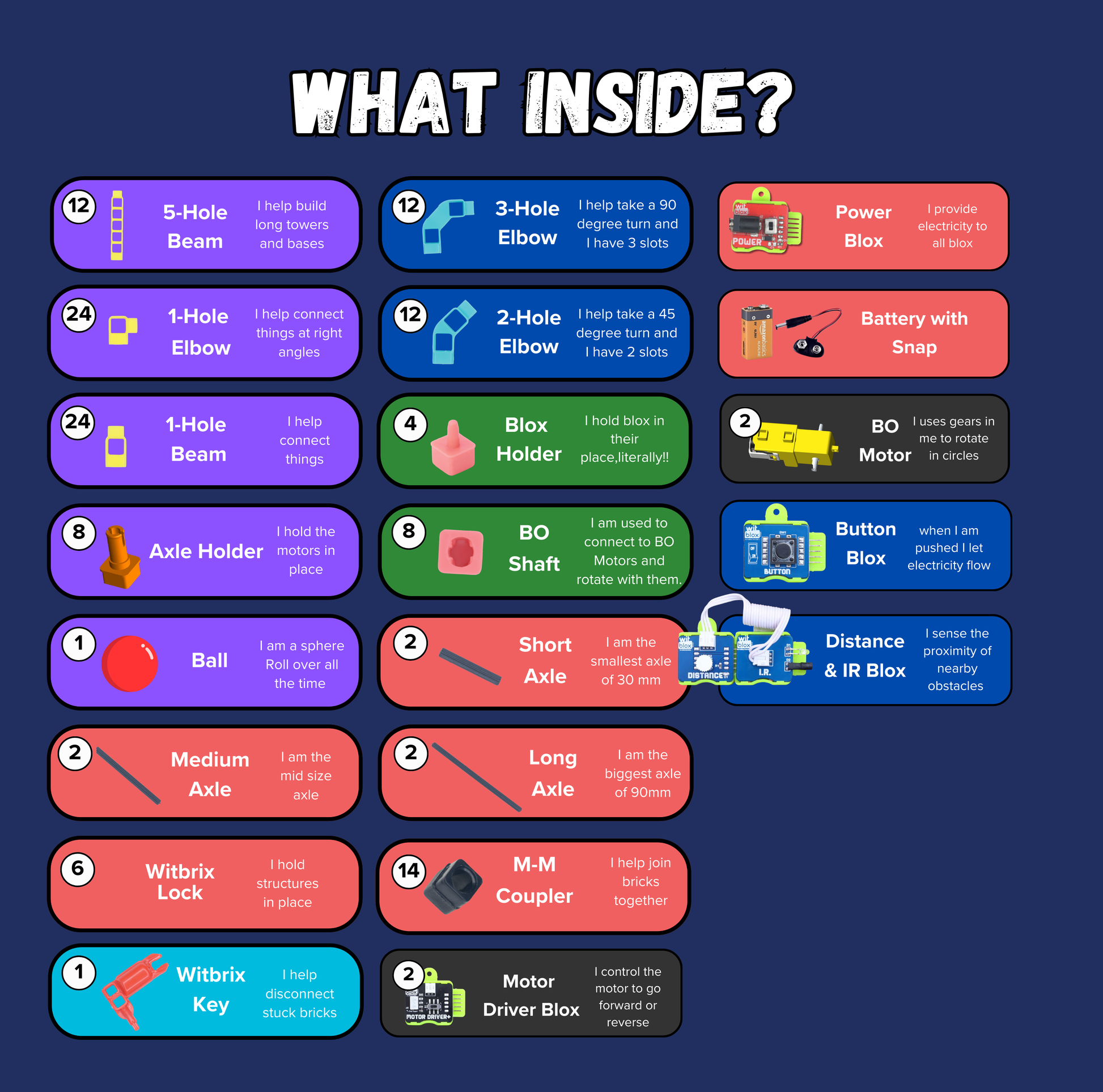 Axle Holder, 5-Hole Beam, 1-Hole Elbow, Ball, Witbrix Lock, 2-Hole Elbow, BO Shaft, Short Axle, Long Axle, M-M Coupler, 3-Hole Elbow, Witbrix Key, Medium Axle, 1-Hole Beam, Blox Holder