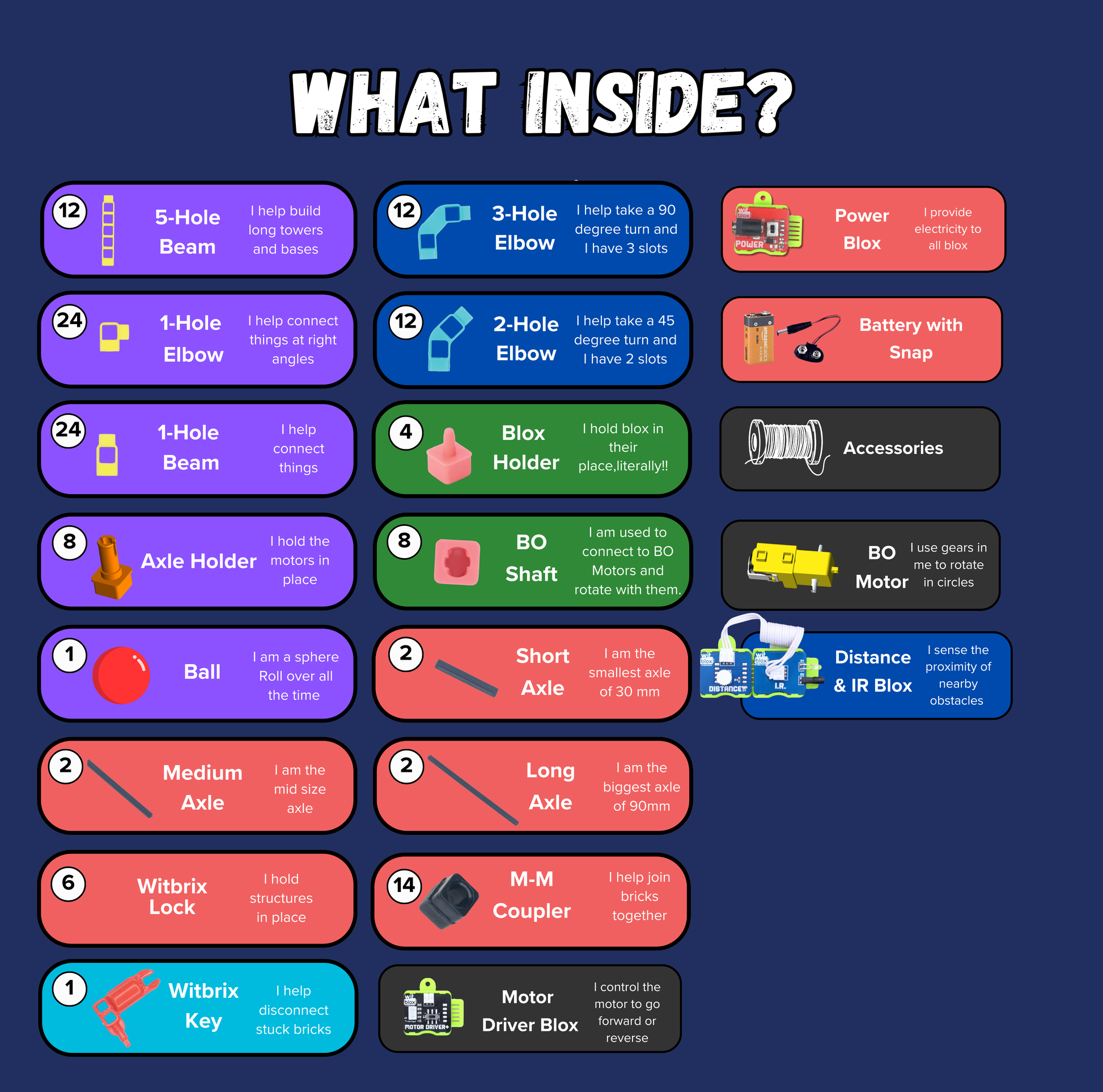 5-Hole Beam, 1-Hole Elbow, Axle Holder, Axle Coupler, 2-Hole Elbow, Battery, 30mm Axle, 90mm Axle, M-M Coupler, 3-Hole Elbow, Witbricks Key, Battery Holder, 60mm Axle, 1-Hole Beam, Blox Holder