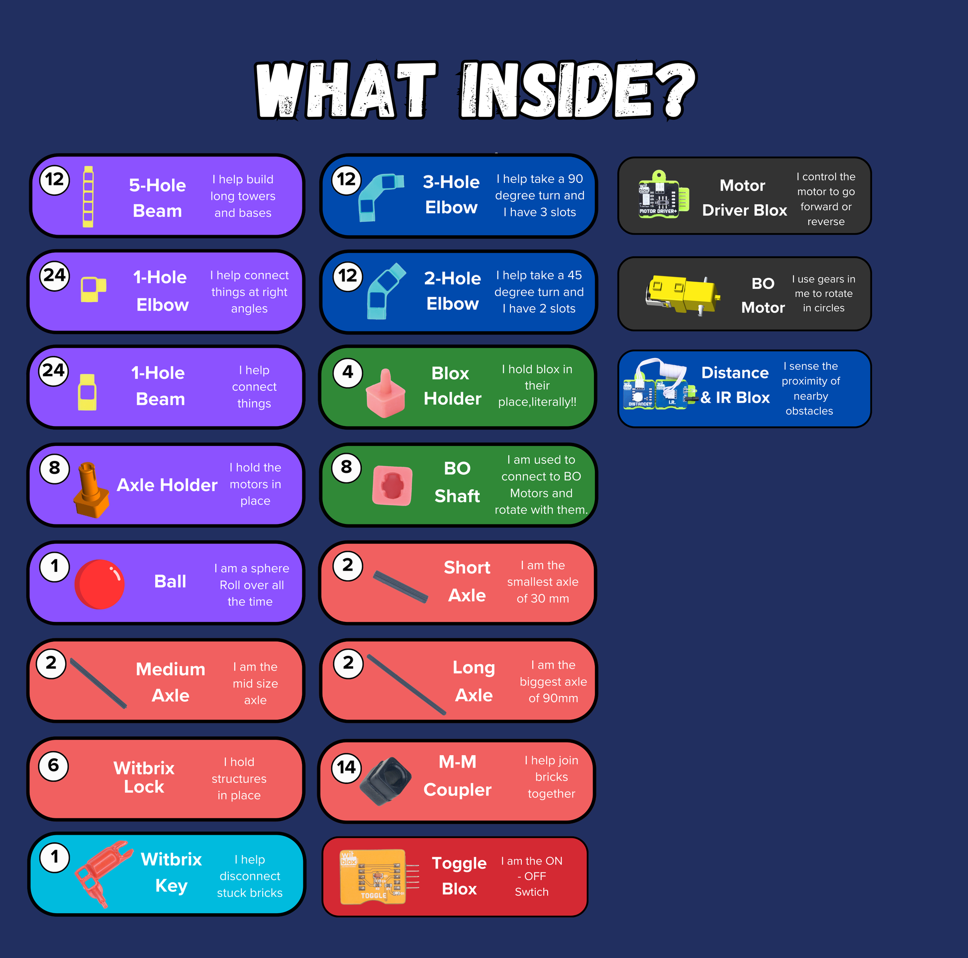 5-Hole Beam, 1-Hole Elbow, Axle Holder, Axle Coupler, 2-Hole Elbow, Battery, 30mm Axle, 90mm Axle, M-M Coupler, 3-Hole Elbow, Witbricks Key, Battery Holder, 60mm Axle, 1-Hole Beam, Blox Holder