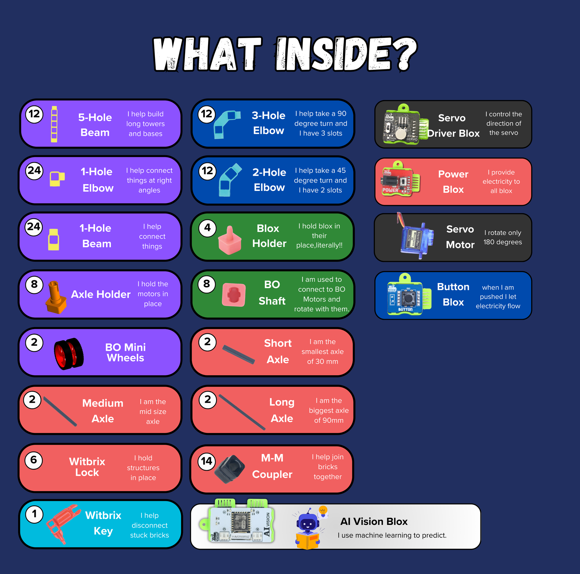 5-Hole Beam, 1-Hole Elbow, Axle Holder, Axle Coupler, 2-Hole Elbow, Battery, 30mm Axle, 90mm Axle, M-M Coupler, 3-Hole Elbow, Witbricks Key, Battery Holder, 60mm Axle, 1-Hole Beam, Blox Holder
